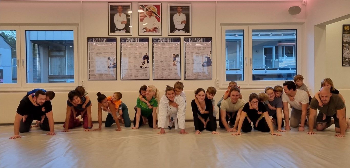 Auch die Eltern sind voll dabei: Gemeinsam mit ihren Kindern lernen sie auf eine sichere, kontrollierte und humorvolle Art, wie man miteinander „raufen“ und gleichzeitig Nähe, Spaß und Bewegung verbinden kann. Für jedes Kind muss 1 Elternteil aktiv auf der Matte mittrainieren.